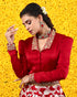A contemporary silhouette that is all about glamour, this bright red collar neck shirt style blouse with the banarasi skirt is an ode to your modern muse. This charming outfit goes well with all glorious celebrations to make an extra enticing and attractive appearance.