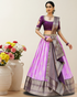 Elegant lavender silk lehenga paired with a rich purple blouse featuring handcrafted Thanjavur swan artwork on the sleeves. Finished with a traditional zari border and contrast dupatta — perfect for weddings and grand festive occasions.