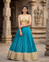 The teal blue silk lehenga features delicate gold butta motifs, finished with a rich broad zari hem that adds structure and grandeur to the silhouette. Paired with a soft gold sleeveless blouse, highlighted by intricate peacock-inspired embroidery, the look feels graceful yet contemporary. The clean lines and balanced color palette make this outfit timeless and versatile.