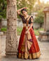 The rich rust-red silk lehenga is adorned with delicate gold motifs and finished with an opulent traditional zari border, creating a majestic silhouette. Paired with a deep brown blouse featuring intricate gold detailing and a flattering V-neckline, the outfit beautifully balances contrast and harmony. The golden zari dupatta, draped gracefully, adds a royal finish to the look.