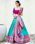 Vibrant teal silk lehenga paired with a rich magenta blouse featuring handcrafted Thanjavur peacock artwork on the sleeves. Finished with traditional zari borders and a contrast dupatta, perfect for weddings and festive celebrations.